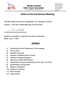 The future of Table Tennis in BC depends on your input as a bonafide BCTTA Member. To draw more players, more attention, more funding, more programs, and more inclusion of diverse communities – then, YOU need to be a BCTTA Voting Member before/on Sept. 3, 2024.