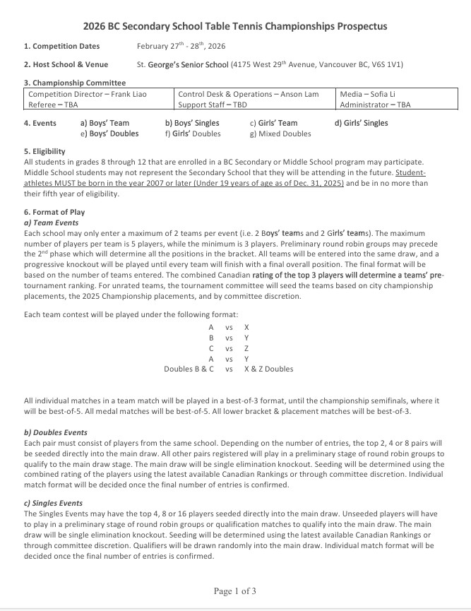 2026 BC Secondary School Table Tennis Championships