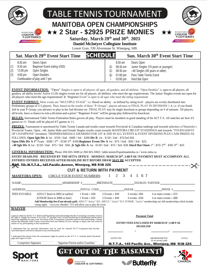 - Table Tennis Tournament – Manitoba Open (Mar 29-30, 2025)